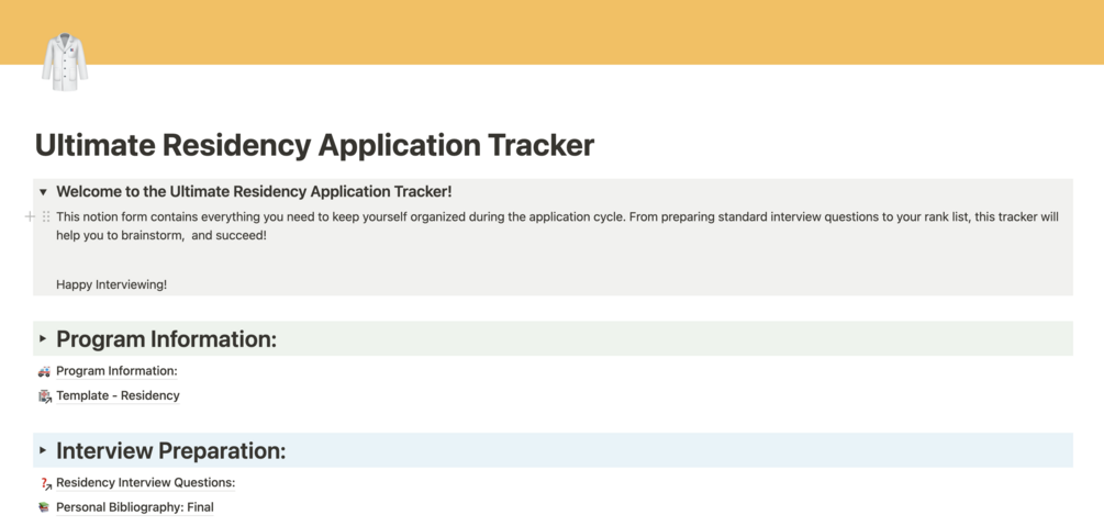 This is a simple-to-use and easily-implemented Notion Database that will help you quickly to organize your residency applications. By using this well-tested system designed by medical students, you will be able to quickly record, store, and review information about your different programs.